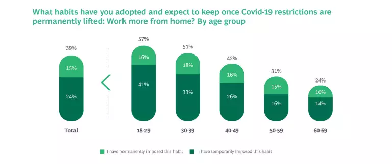 Since the onset of the pandemic, working from home has become the new norm in many industries. About 40% of consumers have been working more from home ~40% of these expect to make this a permanent habit - representing ~15% of all consumers. Over 50% of those under the age of 40 are working more from home during the pandemic, and they are more willing to work more from home post pandemic. In response to this, several global employers have announced a “remote-first” model, and many more have said that they will allow more flexibility than before.