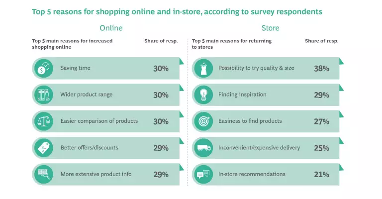 Consumers say they want to go back to brick-and-mortar stores, even if they might complete the purchase online more often than before. The top reasons consumers cite for returning stores are the possibility to try quality and size (38% of sample), finding inspiration (29% of sample), easier to find products (27% of sample), inconvenient or expensive delivery options online (25% of sample), and in-store recommendations (21% of sample).