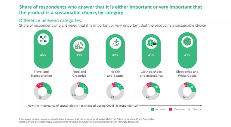 Sustainability awareness has increased significantly over the last 16 months. Across product categories and customer demographics, ~40% of respondents say that the sustainability of the product is important for their purchasing decision. The importance of sustainability is even higher for categories like travel, consumer electronics & white goods, and health & beauty – and it is significantly higher for younger consumers. This new normal requires retailers to adapt both their climate footprint, product and service offering, and communication.