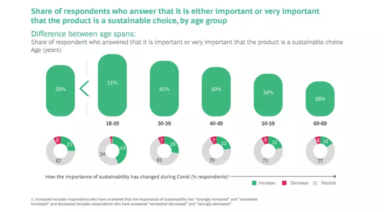 The importance of a retailer’s sustainability actions is likely to increase as younger consumers give more weight to social and environmental responsibility than older generations when making a purchase decision. Our research suggests that more than 50% of consumers aged 18-29 rate it as important or very important in the choice of product. In the same age group ~45% report that the importance has increased during the pandemic which is significantly higher than for the oldest age group. In view of this, it is not surprising that younger generations are also more interested in changing their behaviors to become more sustainable in their day-to-day lives.