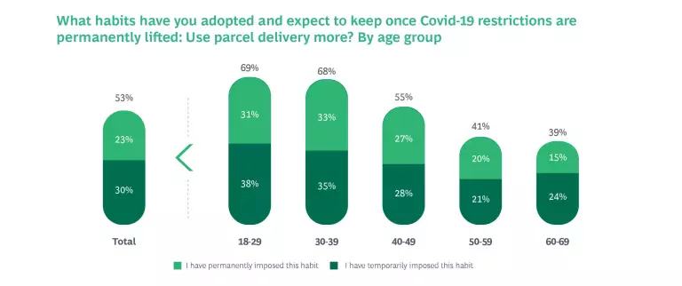 Moreover, working from home makes it easier to receive parcels, and online shopping becomes more attractive. Among consumers working more from home, ~40% say they will permanently increase their use of parcel delivery. This compares to ~20% for those who have not worked from home.