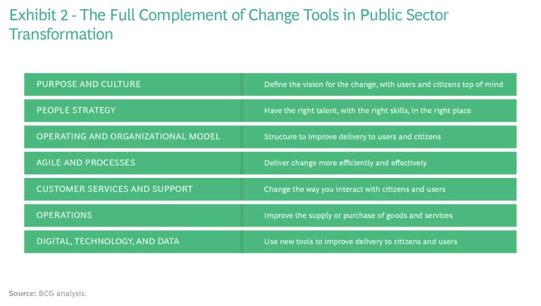 The second secret to overseeing a successful public sector transformation is to understand what needs fixing and then to choose the right tools for the job. By identifying root causes, organizations can select the correct mix of tools, which may range from operating and organization model changes to digital, technology, and data investments. (See Exhibit 2.)
