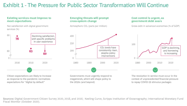 These transformative moves were necessary in the teeth of a crisis. But transformation can and often should be a choice. The forces that precipitated transformation before the pandemic remain in play and may have intensified. Overall satisfaction with digital government services is declining. The climate goals of the Paris agreement remain distant. Government debt is soaring in response to emergency spending during the pandemic. (See Exhibit 1.)