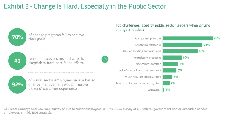 The final secret of public sector transformations is rigor toward process, progress, transparency, and especially people. Sustained change is difficult—increasingly so in the public sector. Leaders face problems with competing priorities, employee resistance, limited funding and resources, inconsistent processes, and poor communication. (See Exhibit 3.)