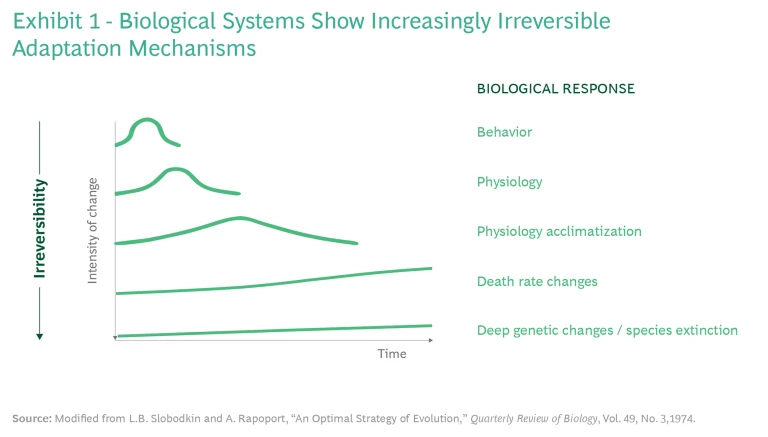 In evolution, organisms often adopt a strategy of progressive irreversibility. (See Exhibit 1.) When a change to the environment is detected, organisms first take reversible actions (such as shivering in response to the cold), only later moving to progressively more irreversible actions (such as ultimately evolving over generations to become inherently better suited for cold weather).
