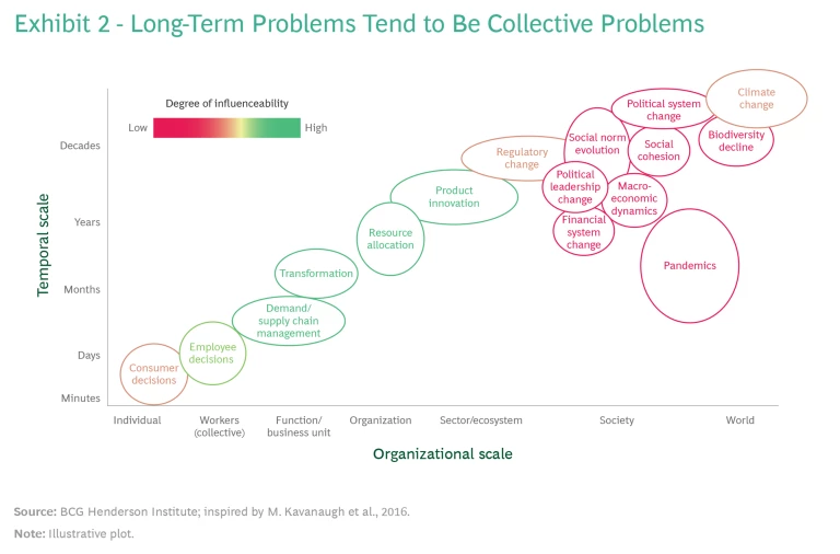 One major insight emerging from our discussion is that long-term problems are generally collective problems. (See Exhibit 2.) Many of the challenges on longer timescales that businesses face, such as maintaining sustainability of the environmental or economic context, cannot be sufficiently addressed only at the level of individual organizations. Instead, cooperation and collaboration are required.