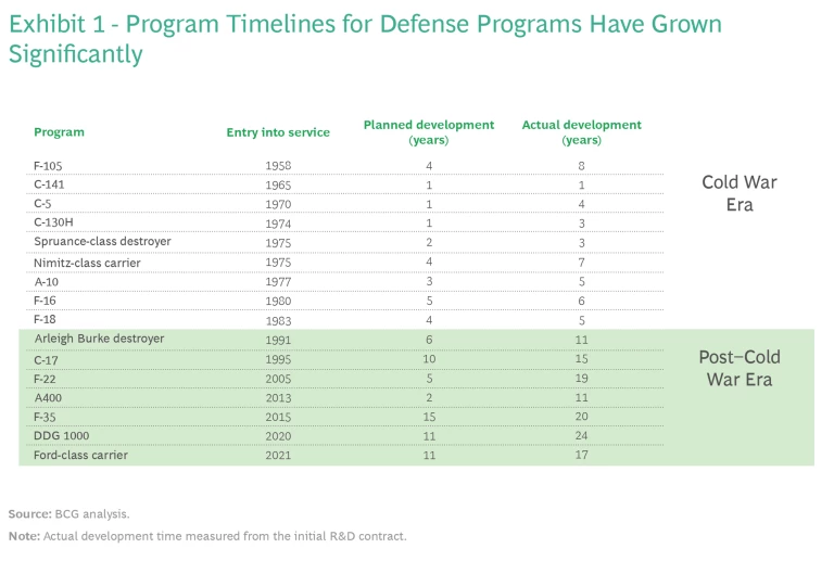 In the last 30 years, both commercial and defense programs have increasingly exceeded their projected timelines. Longer-than-expected delivery has resulted in budget overruns, customer dissatisfaction, and aircraft designed for market and combat conditions that have already passed. During the Cold War, defense programs including both aircraft and ships typically took about five years to develop, but since then the typical program timeline has expanded to 20 years. (See Exhibit 1.) The F-35 has been in development since 1995—a child born when the project started would have graduated college by the time the aircraft was finally deployed in combat.