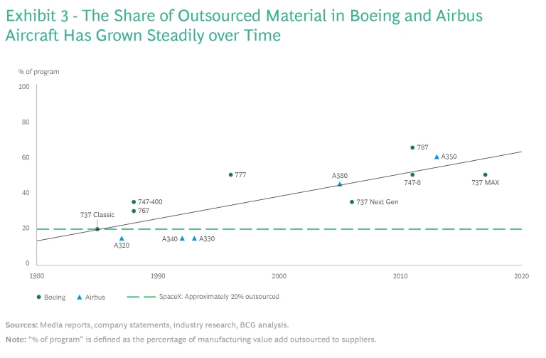 Increased Outsourcing. A desire for asset-light business models has led to more outsourcing among major A&D players. (See Exhibit 3.) This reduces the development costs borne by the OEM and can spread the financial risk of a new program, but it introduces friction and complexity, in part because aerospace and defense suppliers often face little meaningful competition, but also—and maybe more importantly—because it requires stronger collaboration on more complex topics, as increased outsourcing means wider responsibility for a supplier at the system-integration or architecture level.