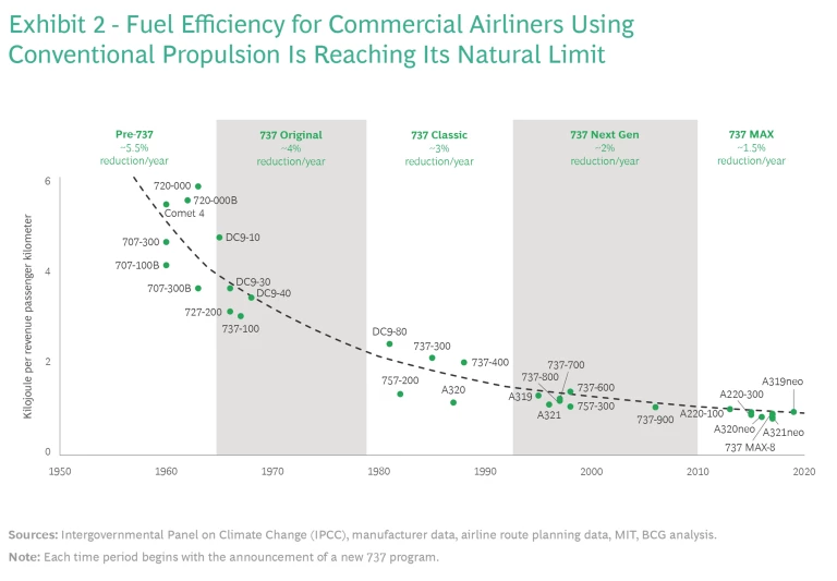 This tendency to reach for immature technology is driven largely by the fact that major advances in performance are getting harder to achieve. For example, the fuel efficiency gains for single-aisle commercial aircraft have been slowing over time as they approach the natural limits of current designs. (See Exhibit 2.)