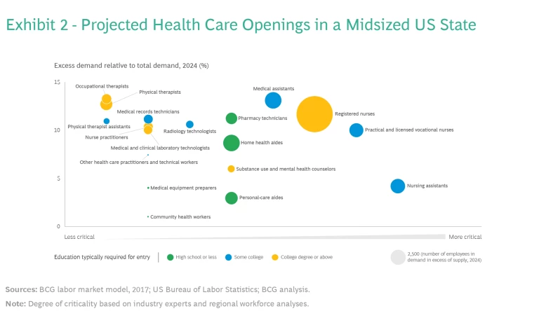 Before the pandemic, we projected the health care workforce needs of a midsized US state in 2024. Analysis of qualitative and quantitative data allowed us to identify not just which jobs had the most openings but where the mismatch between supply and demand was greatest. In this one state, the largest number of openings was for registered nurses, but the need for medical assistants, who do not require a four-year college degree, would in the future be more critical, according to experts. (See Exhibit 2.)
