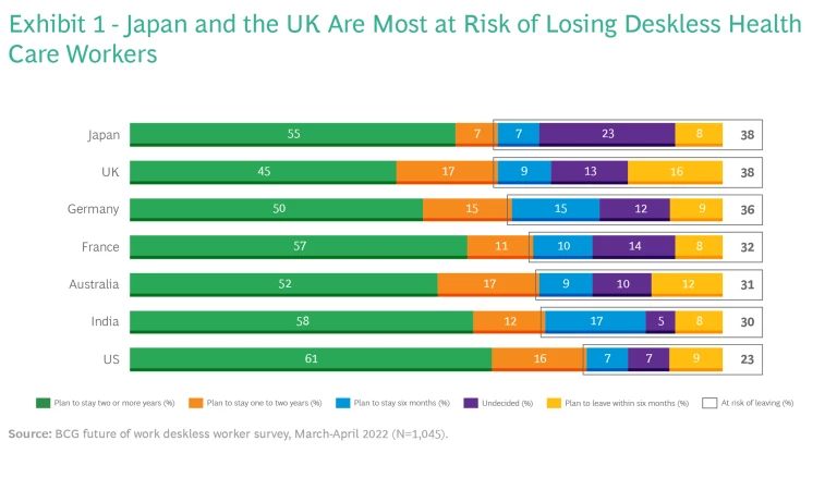 We recently surveyed more than 1,000 “deskless” health care workers in seven countries. These workers need to be physically present to perform many of the jobs that health care requires. A third of them are at some risk of leaving their jobs in the next six months, the survey found, with those in Japan and the UK most likely to do so and those in the US least likely. (See Exhibit 1.)