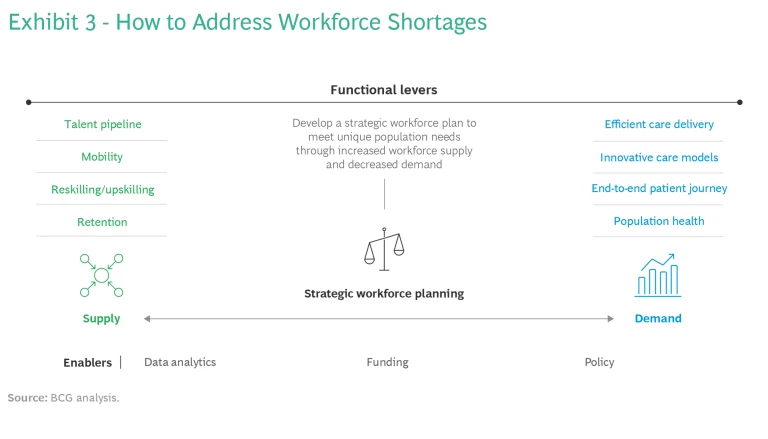 Fundamentally, all workforce shortages stem from an imbalance between supply and demand. Any solution must therefore provide a mix of tools aimed at managing supply and reshaping demand. (See Exhibit 3.)