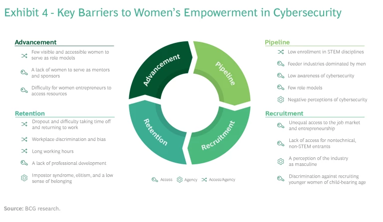 One key barrier to access that emerges in this stage is the tendency to want to recruit the “perfect candidate”—a tendency that kills diversity. Recruiters seek candidates who look like current employees, with the right tenure, education, and technical expertise; given the urgent need in the workplace, they are reluctant to consider candidates who will require training. This thinking can exclude women, particularly young women who are new to the field—and it doesn’t help close the workforce gap. Access could be improved here by expanding the lens to include nontraditional candidates, sometimes hiring based on aptitude and being prepared to train or reskill for specific cybersecurity roles. Targeting women for internships is another way to address the issue.