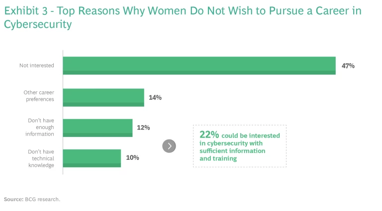 Our survey also explored the reasons why some women said they did not want to pursue a career in cybersecurity. (See Exhibit 3.)