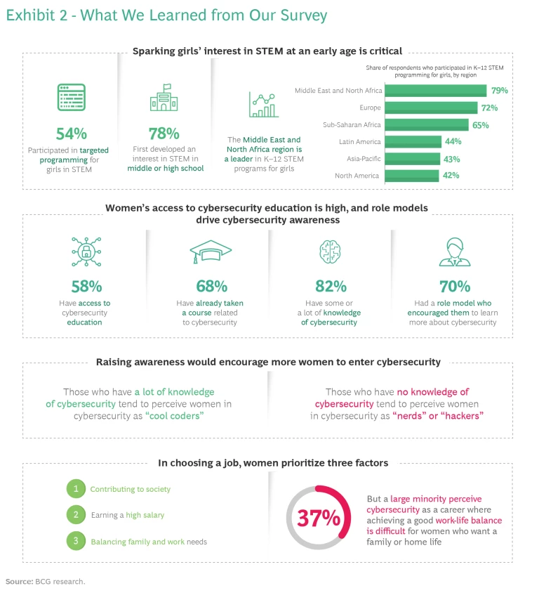 In partnership with Ipsos, BCG conducted an online survey of 2,000 women undergraduate students in STEM (science, technology, engineering, and math) fields in six regions and 26 countries between February and March 2021. This survey was launched to provide insights into women’s potential challenges entering STEM studies and their interest in and perceptions of cybersecurity careers. Survey questions addressed the significant global data gaps identified after a thorough global baseline assessment of women’s empowerment in cybersecurity.