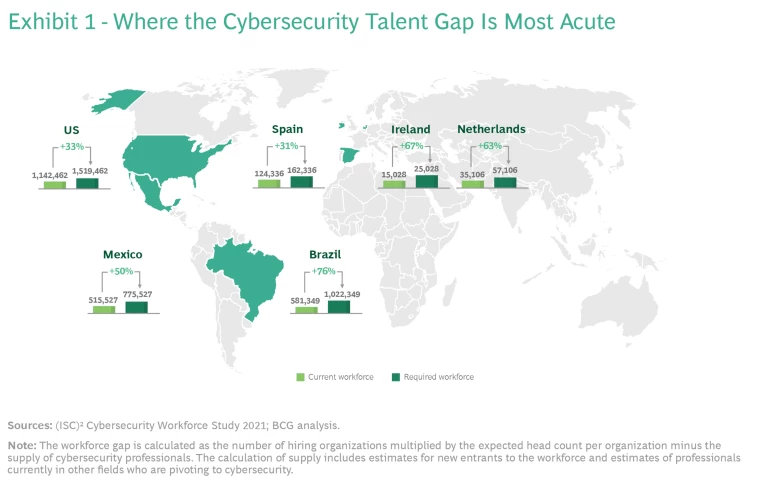 The global cybersecurity workforce was short some 3.5 million workers in 2021, according to Cybersecurity Ventures; by that count, the workforce of 4.4 million was 80% shy of the demand. (See Exhibit 1.) Concern over the dearth of tech talent in general has been growing for years, but it’s coming to a head as organizations increasingly rely on digital. With cybercrime on the rise, the shortfall in cybersecurity is particularly urgent.