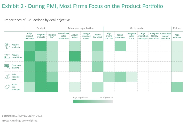 Regardless of deal thesis, companies typically focus on product integration after the close. That makes sense if the deal is aimed at acquiring products, but for three other deal theses—acquiring capabilities, entering new markets, and growing the customer base—the No. 1 priority in terms of PMI is also product integration. Go-to-market aspects such as sales and marketing is a distant second in most cases—and sometimes it’s third or fourth. (See Exhibit 2.)