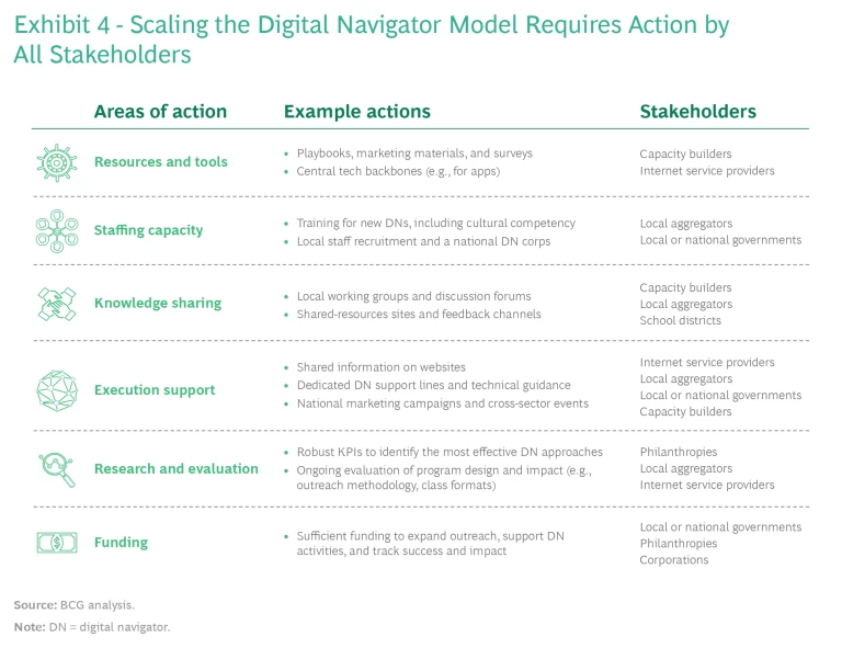 Ecosystem stakeholders include not only digital navigators but also local digital navigator aggregators (community entities that lead knowledge-sharing initiatives), capacity builders (national nonprofits that create some basic foundational resources and advocate on behalf of digital navigators), philanthropies, ISPs, device manufacturers, school districts, and local, state, and federal government representatives. Stakeholders should take action in six critical areas (see Exhibit 4):