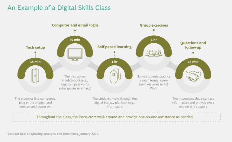 When observing group classes, we again saw the benefits of personal attention. (See the exhibit “An Example of a Digital Skills Class.”) Group classes combine lectures with periods when learners engage in self-directed exercises and instructors move from student to student providing one-on-one support. In one case, an instructor helped diagnose that a number of participants had made mistakes (such as adding an unneeded space in their email address) when trying to sign in to their accounts. The classes also strengthened the bonds of community within the group by having students collaborate on activities.