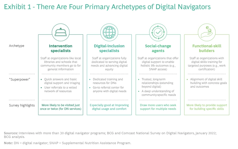 Four Archetypes. To understand the universe of digital navigators, we looked closely at what they do and how they help people at different stages of their connectivity journeys. On the basis of those factors, we identified four digital navigator archetypes (see Exhibit 1):