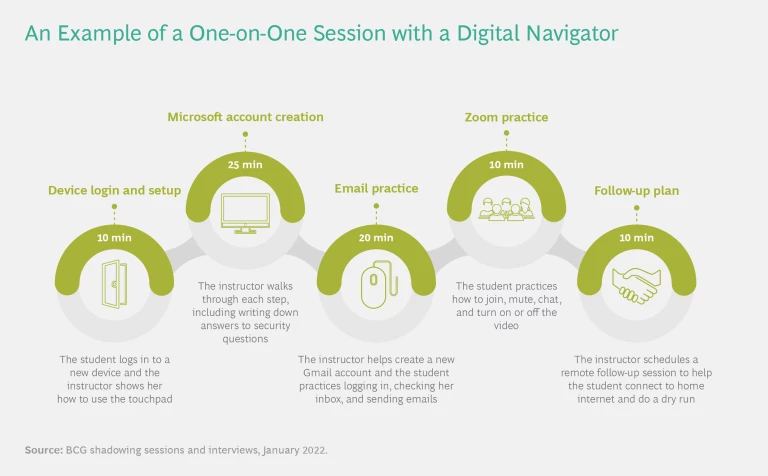 As we watched digital navigators in action (in remote classes, group meetings, and one-on-one sessions) and spoke with users directly, we saw firsthand how patience, repetition, and smart questions and exercises—often over several hours—enabled people to build digital readiness. (See “The Personalized Connectivity Journey.”)
