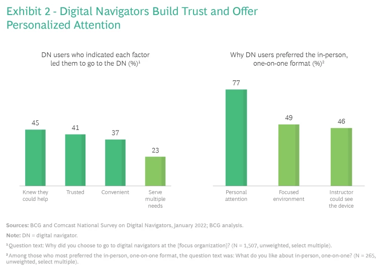 A Winning Relationship. The success of digital navigators is driven by a combination of trust and personal attention. (See Exhibit 2.) The best ones meet people where they are and provide digital support to those most in need.