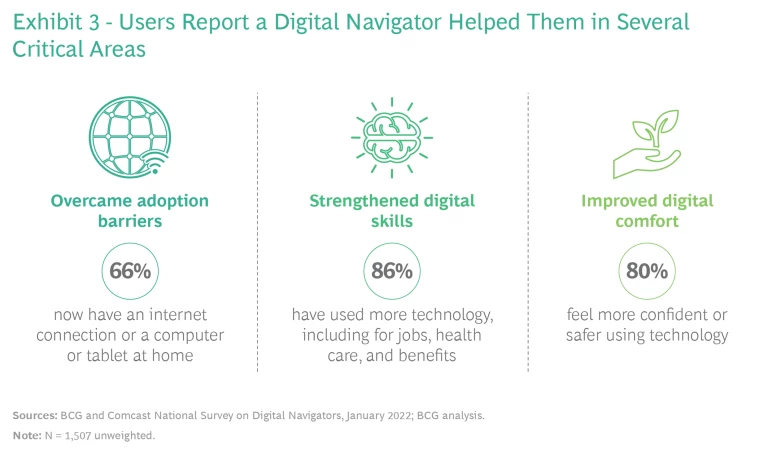 The need for action to expand digital equity—already urgent before the pandemic—is even higher today and only likely to grow more so in the future. In the past, BCG has studied the impact of the digital divide, barriers impeding internet adoption, and steps needed to close the gap. This year, we took a close look at the role that digital navigators can play in addressing the problem. (See “Studying the Digital Divide.”)