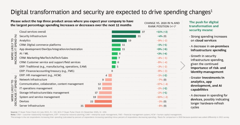 Despite any recessionary fears they may have had, IT decision-makers on the whole recognize that returns on many of their key projects are still healthy, as is business demand. As a result, they remain focused on their long-term priorities, particularly the ongoing push for digital transformation, and are boosting their investments in cloud, analytics, app development, and AI capabilities. In addition, cybersecurity is still an imperative, with 31% of respondents saying they are more likely to increase their IT spending on security infrastructure than they were in 2021.