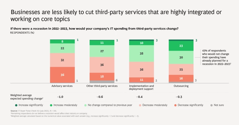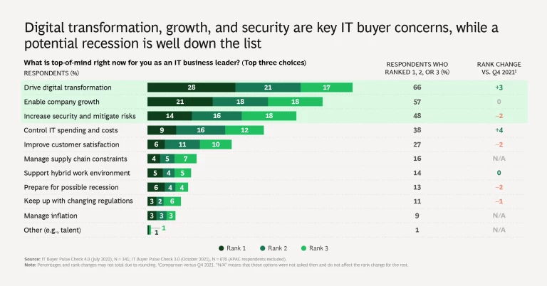 Despite this caution, buyers are not planning to freeze their spending as dramatically as they did in the early days of the pandemic, when nearly 60% of our survey respondents paused deployments of new technology and 54% delayed hardware upgrades. In addition, only 13% of buyers in our new survey ranked a potential recession among their leading concerns, while 61% said that they had not made any spending adjustments in preparation for one.