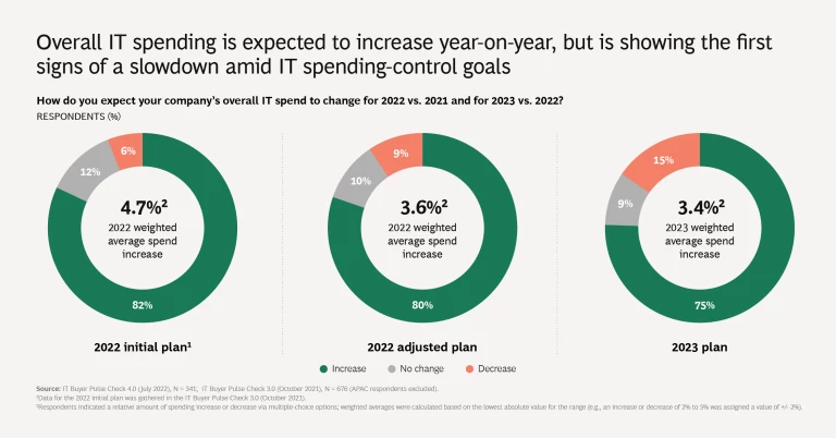 IT buyers across the US and Europe are showing signs of caution as they anticipate a potential downturn in 2023 or beyond. In our fourth IT spending survey, which took place in July, respondents reported a slowdown in their initial 2022 outlay plans, from a 4.7% spending increase to just 3.6%—with only a 3.4% increase anticipated for 2023, including inflation. (See “Our Methodology.”)