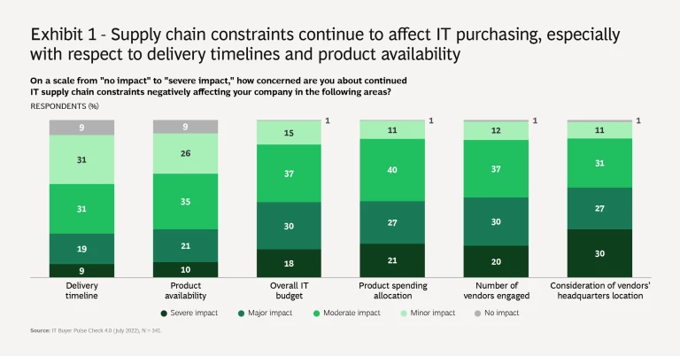 Perhaps unsurprising, most of our buyers were already encountering inflation and supply shortages in July, with over 80% of respondents stating that many or almost all of their suppliers had increased prices in the last 12 months. About 60% of buyers also reported that their suppliers had deployed two or more measures to combat rising inflation, including delaying deliveries and renegotiating contracts and SLAs—the most common mitigation measures. Given this context, delivery timelines and product availability were still an issue as of our survey, although only about 23% of IT buyers believed that supply chain constraints were significantly affecting their IT purchasing decisions. (See Exhibit 1.)