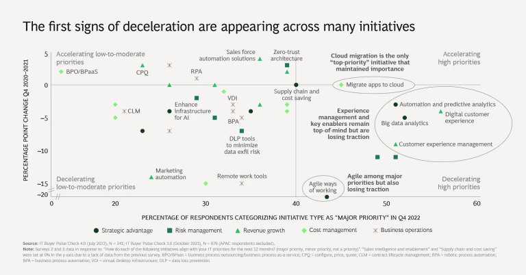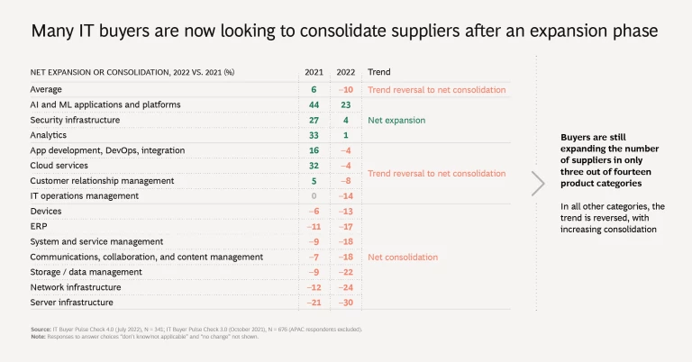 After a general expansion phase in the supplier base over the past two years, we also found many buyers beginning to consolidate their purchases, often choosing integrated offerings over best-of-breed. To win in this environment, IT vendors will need to offer a distinctive value proposition in terms of both productivity and efficiency. Larger incumbents will naturally be better-placed as consolidation continues, while those offering cutting-edge or single best-of-breed products—who were likely more successful in 2021—may now find the going a little tougher. (See slideshow 1.)