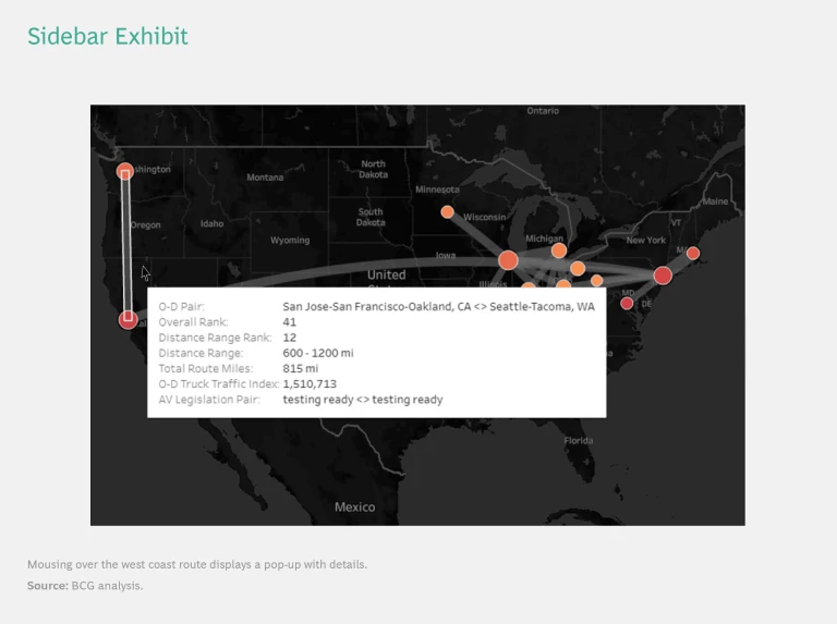 To realize these benefits and get the most value from AV trucks, it makes sense for companies to start planning which routes make the most sense for expanding their operations. Tools like the BCG GAMMA dashboard can help players identify the top AV trucking routes to prioritize—both in the current pilot phase and when taking the industry to scale—to capitalize fully on the promise and potential of autonomous trucking.
