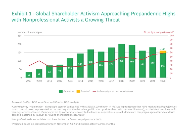 Second, these numbers mask the rise of the new generation of activists. Nonprofessional activists—defined as entities that have conducted two or fewer campaigns since 2000—now lead the majority of campaigns. In 2012, they accounted for approximately a quarter of attacks; by 2021, the percentage had exceeded 50%, and in 2022 it stands at nearly 60%. (See Exhibit 1.)