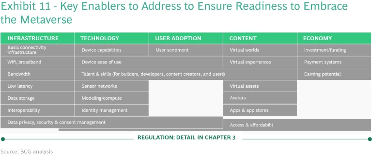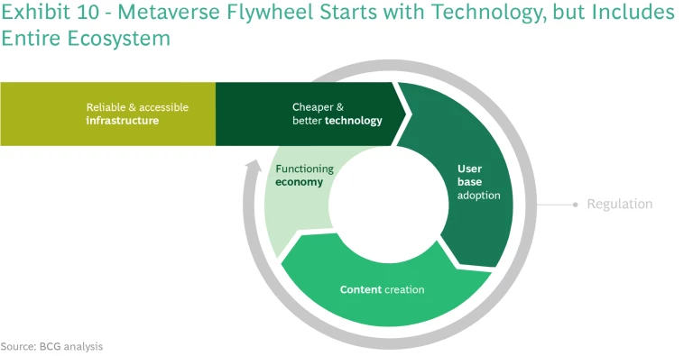 Several types of enabler must be in place for the metaverse to develop and function. We envision these operating as a flywheel, each one building on the previous and generating momentum that advances the entire system. Technology is critical, but is just one piece of this broader ecosystem required to unlock the metaverse. We have organized the enablers into categories or pillars: reliable and accessible infrastructure, cheaper and better technology, user base adoption, content creation, a functioning economy, and – foundational to it all – regulation (Figures 10 and 11). Note that Figure 10 also shows a “sub-flywheel” between content and user base adoption, with each one requiring and reinforcing the other. For example, users join a platform to engage in content, while content is only created if and when there is a user base to engage with it.
