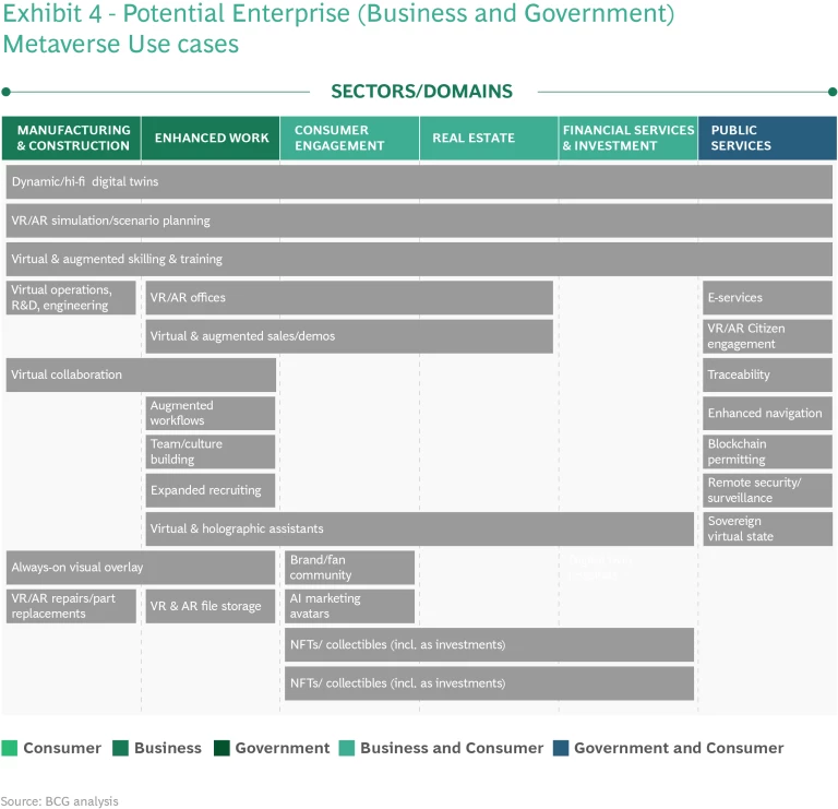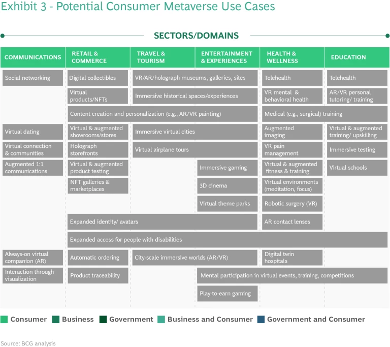 Despite the metaverse’s current nascent state, these comments highlight some common themes. The metaverse can be understood as a mix of virtual and physical-life, enhancing (not replacing) experiences in the physical world. Its most significant distinction from today’s internet is the feeling of real presence. Even if today’s technology only gives us a glimpse of what it could become, the applications of early metaverse platforms are moving beyond gaming experience, expanding rapidly into other high-impact sectors like healthcare, education, and tourism. Looking forward, the metaverse might eventually be interoperable in terms of both software and hardware, with aligned platforms, networks, and technical protocols and standards allowing the various technologies (in phones, AR glasses, VR headsets, etc.) to interact.