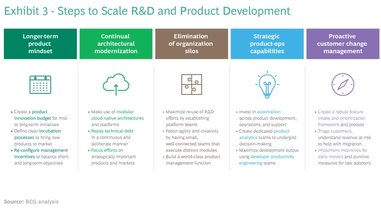 Fortunately, there are relatively straightforward answers to address the difficulty of scaling R&D: adopt a long-term product investment strategy while maintaining an effective portfolio in the short term; track and repay technical debt to drive continual architecture modernization; break organization silos, by investing in shared services and product management; invest in product scale multipliers; and manage customer change, being prepared to say no. These steps will not only generate again significant returns from R&D but make software companies feel more confident about coming out on the winning side of innovate or die.