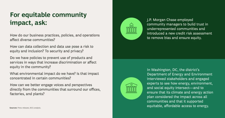 - Address the secondary implications of policies, operations, and practices. Are certain groups disproportionately affected by negative or harmful byproducts? Consider, for example, any disproportionate environmental impacts of an organization’s facilities on low-income or immigrant communities, or the data protection concerns that might arise from the use of consumer data to inform company strategy or product development.