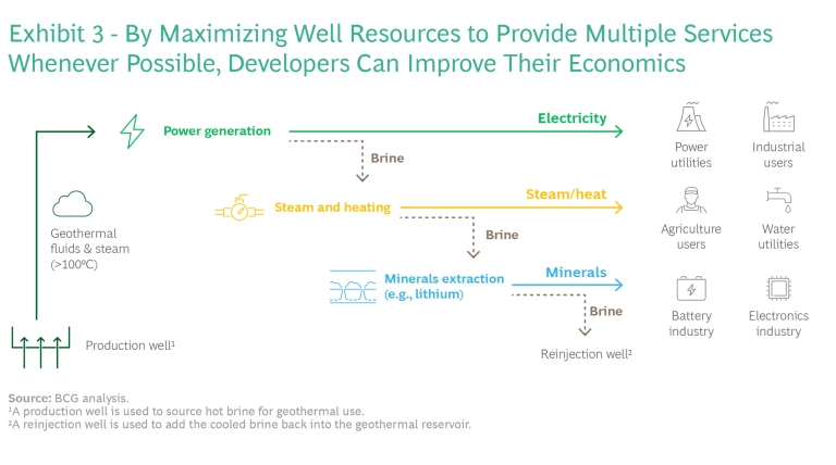 Developers are already improving project returns by combining power generation with mineral extraction. For example, BCG estimates suggest that, by doing this, geothermal companies near California’s inland Salton Sea may have increased project returns by up to 10 percentage points. Importantly, we believe that a multi-service approach could increase the number of revenue streams from low-enthalpy, mineral-rich fluids, so that wells become commercially viable.
