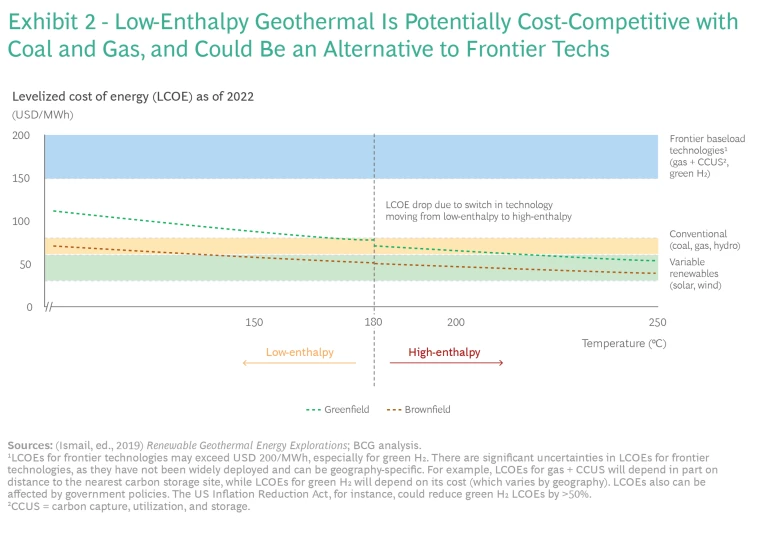 According to our models, low-enthalpy geothermal may already be cost-competitive with fossil fuels and renewables as a source of power generation in some areas. (See Exhibit 2.) This assessment depends on companies using brownfield sites to build geothermal wells, an approach that is still being trialed. (See “How Brownfield Sites Can Cut Development Costs.”)