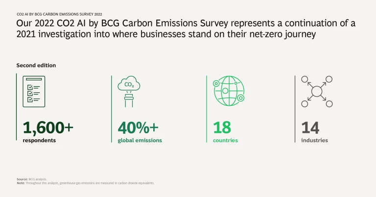 Our 2022 CO2 AI by BCG Carbon Emissions Survey continues a 2021 investigation into the progress that organizations around the world have made in measuring and reducing their carbon emissions.