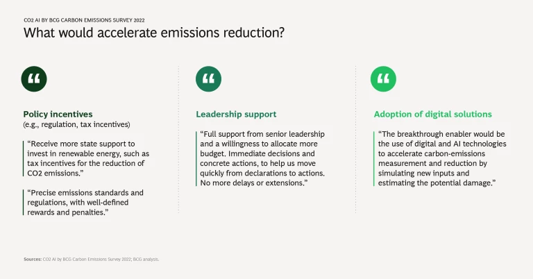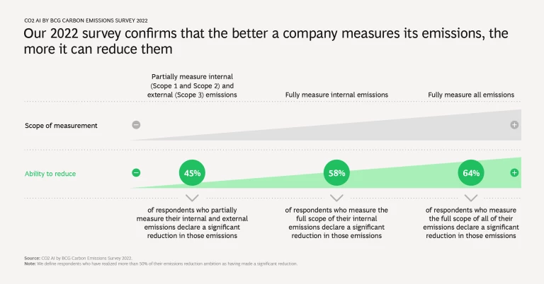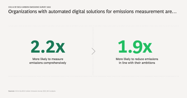 Our survey finds that organizations that have adopted automated digital solutions for emissions measurement are 2.2 times as likely as their peers to measure their emissions comprehensively and 1.9 times as likely to reduce emissions in line with their ambitions. (See “CO2 AI by BCG Case Study.”)
