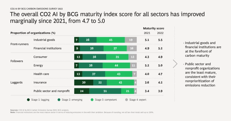 Perhaps not surprisingly, the average CO2 AI by BCG maturity index for those surveyed—gauged on the basis of their answers about emissions measurement and reduction—improved only marginally in this year’s survey over the previous year’s, from 4.7 to 5.0. Overall, industrial goods businesses and financial institutions outperformed companies in other sectors, while public sector and nonprofit organizations lagged behind.