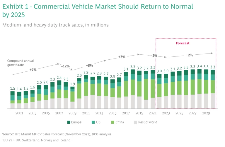 Back-to-back crisis years, because of the COVID-19 pandemic and the global semiconductor shortage, have affected both the demand for, and the supply of, commercial vehicles. But several factors—the jerky return to economic normalcy last year, the growth of e-commerce, and the impending investments by several governments in infrastructure and supply chain development—returned global vehicle sales to their traditional levels in 2021. The recovery was driven mainly by the Chinese market, with Europe and the US still suffering from the pandemic-induced recession.