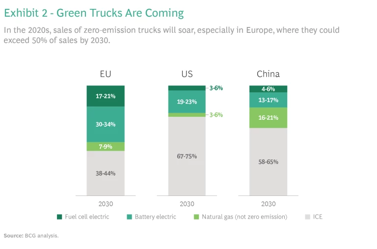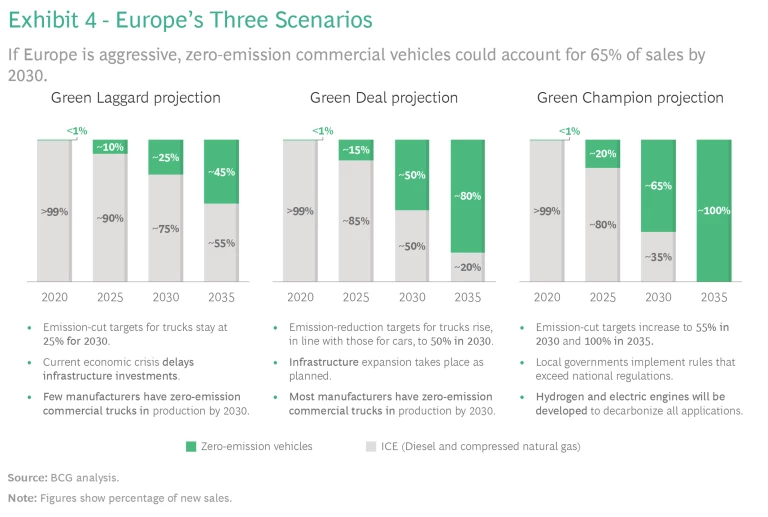 Europe. Europe could turn into a green laggard if its targets for reducing vehicle emissions stay static at 30% in 2030. In that worst case, the demand for zero-emission powertrains will rise from 1% in 2020 to just 25% in 2030. If Europe can deliver on its Green Deal, with emission-cut targets rising to around 50% in 2030, the demand for green trucks will rise to as much as 50% of all the new ones sold. The continent could even stay the green champion by increasing its emission-reduction targets further. The demand for zero-emission trucks would then shoot up to 65% by 2030, and 100% of all the new commercial vehicles sold by 2035. (See Exhibit 4.)
