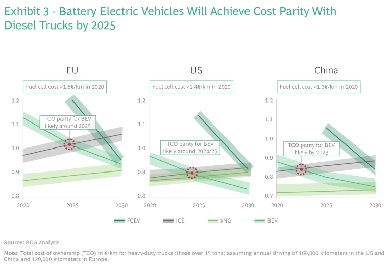 Economics. At the micro or buyer level, the use of zero-emission vehicles by fleet operators is nearing a tipping point. The total cost of ownership for battery electric vehicles will attain parity with that of conventional vehicles soon, between 2023 and 2025, and fuel cell electric vehicles should follow suit between 2028 and 2030. (See Exhibit 3.) In an industry where margins have always been wafer-thin, electric powertrains must become cost competitive if fleet owners are to adopt them.