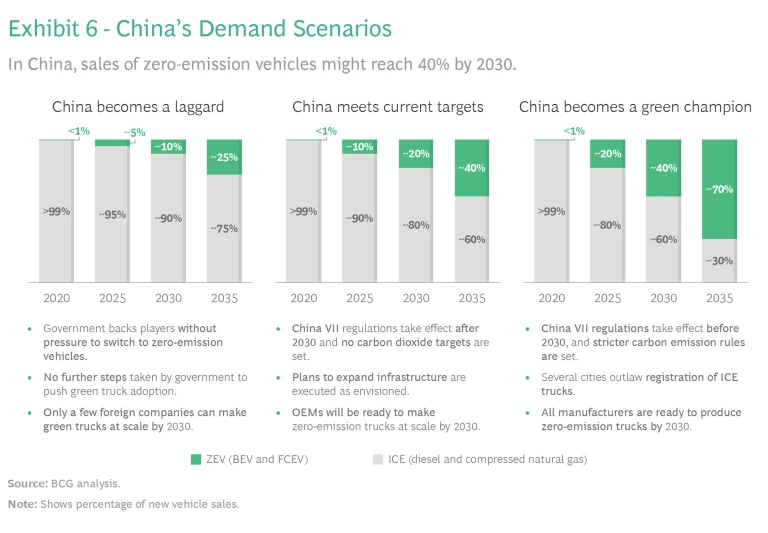 China. If the Chinese government doesn’t push the state-owned manufacturers, which are focused on reducing emissions from their diesel engines, to make more zero-emission vehicles, the latter’s share will rise from the current 1% to just 10% by 2030. China’s carbon emissions won’t peak until the 2030s, so the state doesn’t see the need to cut emissions immediately. Tighter regulations and stricter implementation will cause the demand for zero-emission vehicles to rise to 20% by 2030. Promisingly, there’s been talk about China aspiring to become a green champion by developing a new set of emission regulations. With the country’s truck-makers, such as FAW, already kicking off the production of electric trucks, the demand for them would then rise to as much as 40% of the market by 2030. (See Exhibit 6.)