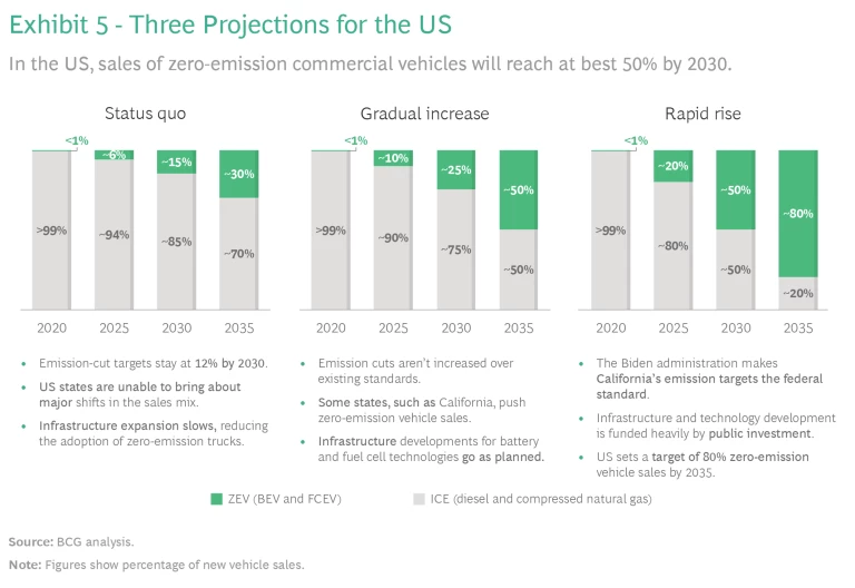 United States. The US could remain a green laggard, with its emission-reduction targets staying at the current level of 12% a decade from now. If that happened, the demand for zero-emission vehicles would rise to just 15% by 2030. Of course, America could gradually step up its emission-cut targets, with several states pushing the use of green trucks, increasing the demand for zero-emission vehicles to 25% by 2030. And the US could become a green champion if the Biden administration, as it promised when it came to power, makes California's emission goals the national standard. That alone would ensure that sales of zero-emission vehicles would top 50% of the US market by 2030. (See Exhibit 5.)