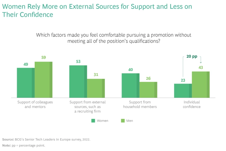 A key finding of the survey is that when making careers decisions, women tend to rely more on strong networks of support for advice—such as recruiting firms, peers, mentors, sponsors, line managers, affiliation groups, and household members—while men are more likely to rely on their self-confidence in addition to their networks. (See the exhibit.)