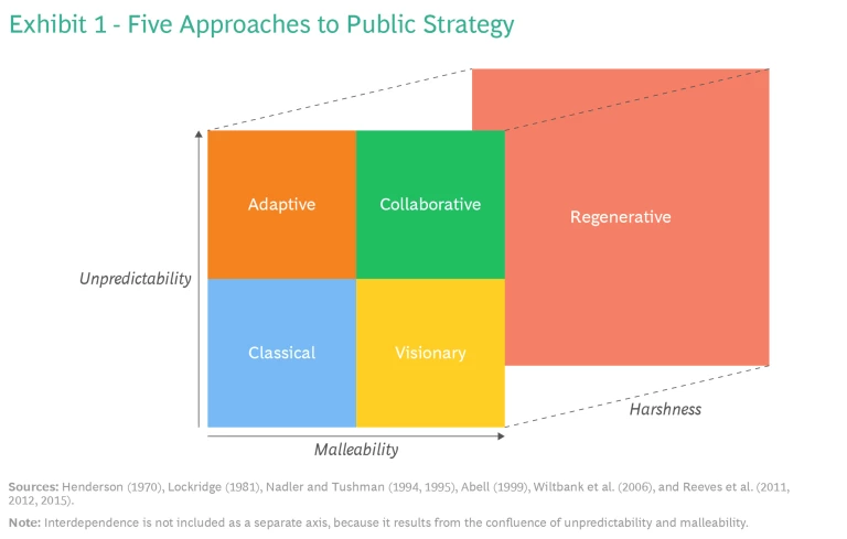 Collaborative. Agencies that navigate malleable but highly unpredictable domains require a collaborative approach to strategy. The purpose, similar to the aim of the visionary approach, is to reshape the domain. In the face of a highly dynamic and unpredictable environment, however, it isn’t feasible for an agency to craft and realize a vision on its own.